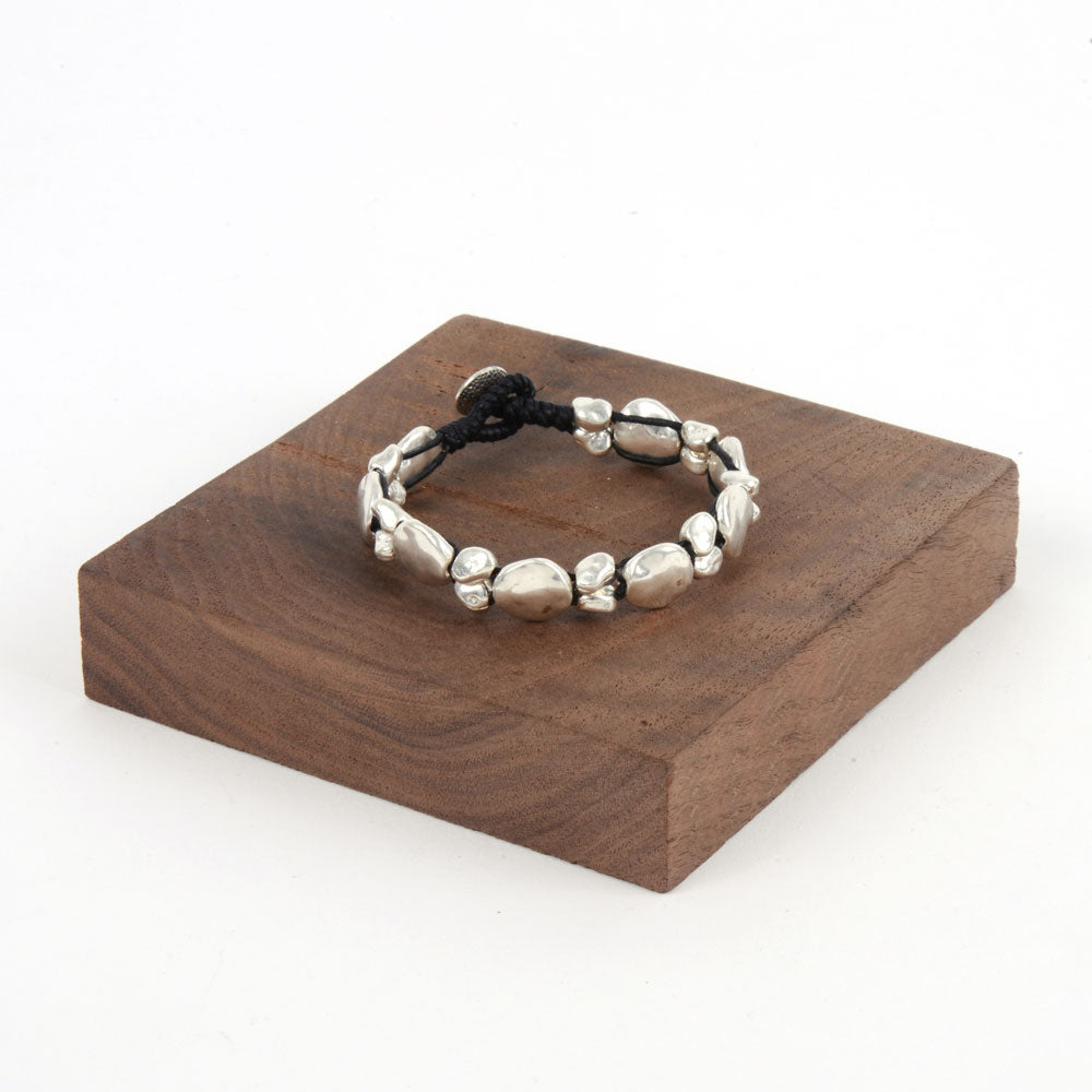 A Mix of small round nuggets and larger oval nuggets hand knotted with black waxed string. Since it is knotted, if you need it a little bigger, a gentle pull is all you need to do.