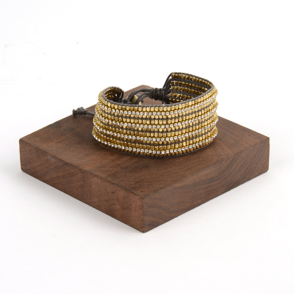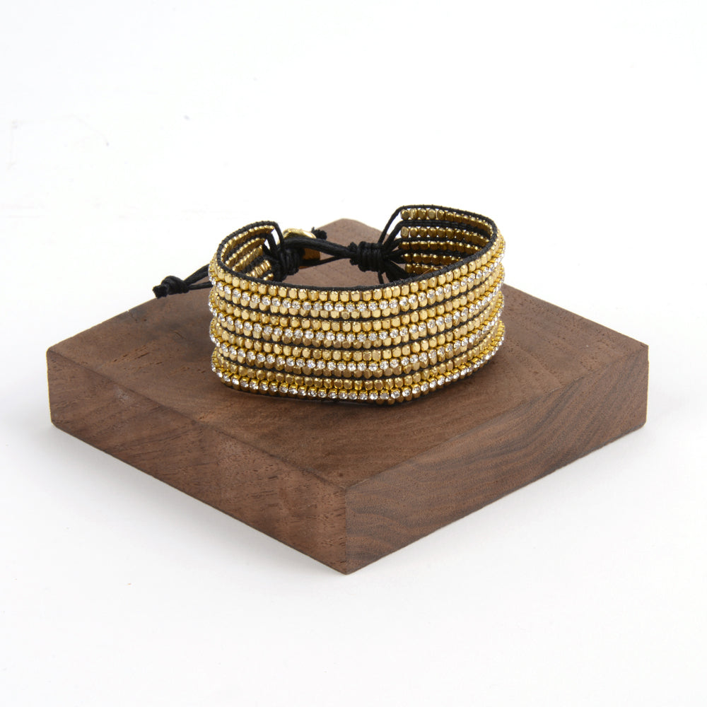Super Casual and fancy! 4 Rows of CZ with adjustable button clasp. Gets rave reviews when spotted out and about town. Bracelet is 1.25" wide. Choose from black or grey string.