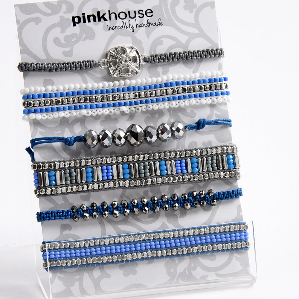 Set of 6 bracelets in complimentary tones combining glass beads, metal beads and crystals. Mix and match for multiple looks. Sliding knot clasp easily adjusts to fit most wrists.