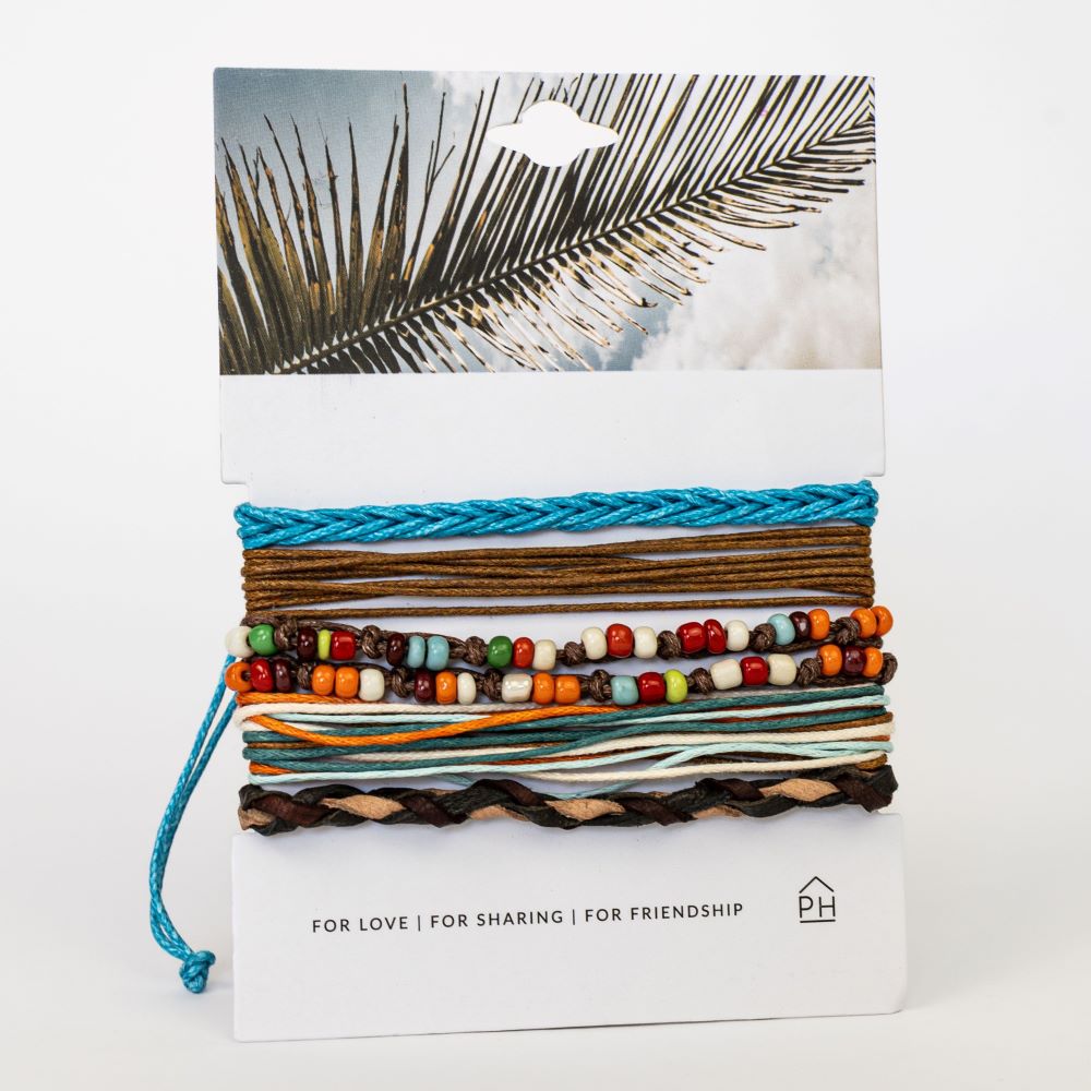 Set of 5 handmade bracelets in complimentary tones. Wear them all together or mix and match for multiple looks. Sliding knot clasp easily adjusts to fit most wrists. Handmade in Bali.