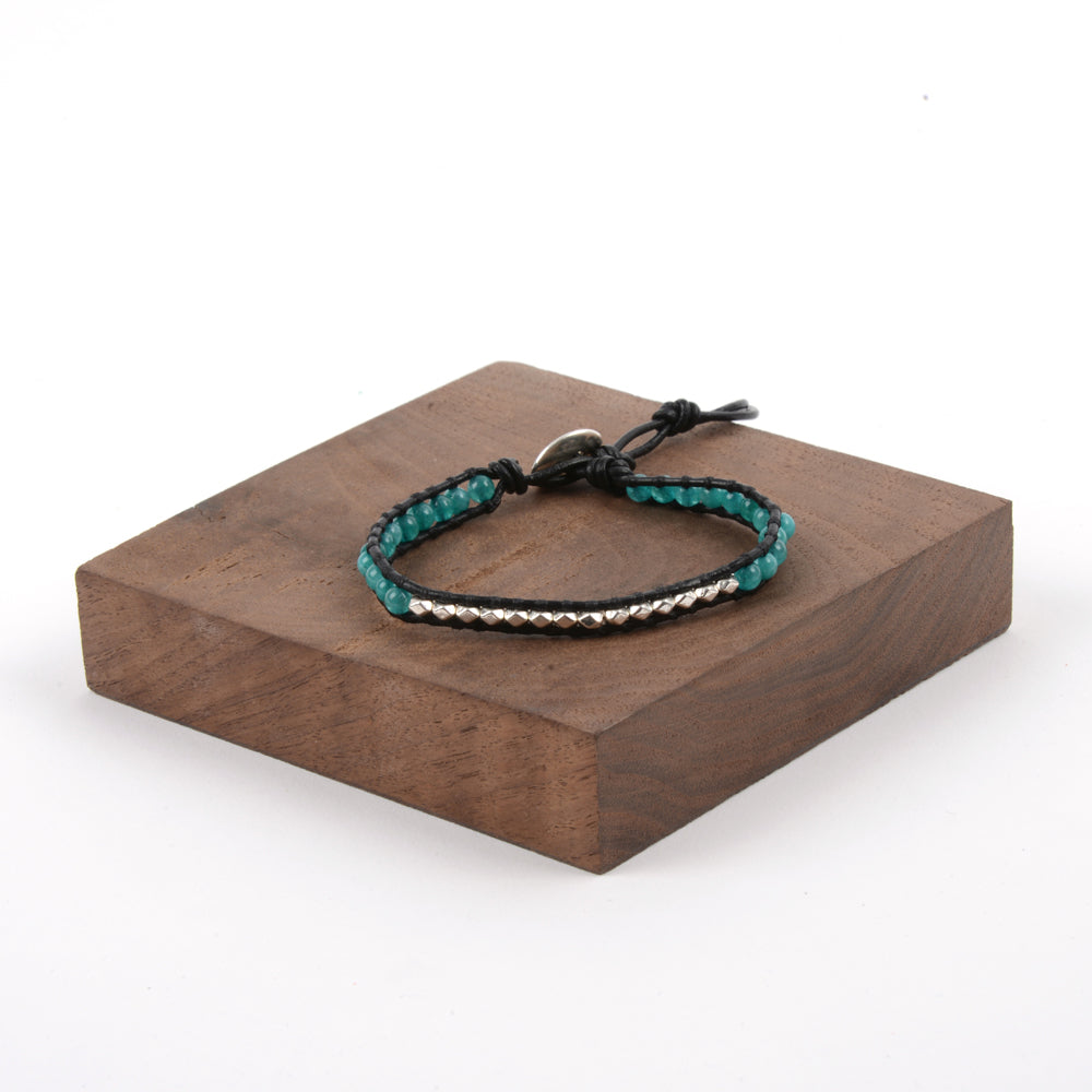 Small diamond shaped silver plated nugget beads and round turquoise beads mix for a simple eye catching bracelet. Stack this wrap style bracelet with any of our other nugget bracelets. Black leather cord with a button clasp in a slim profile. Mix this with a larger bead version for texture.