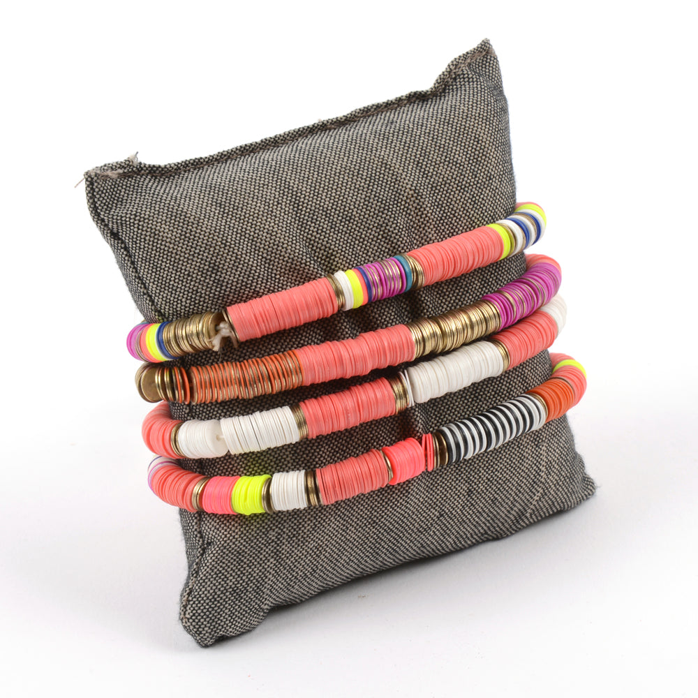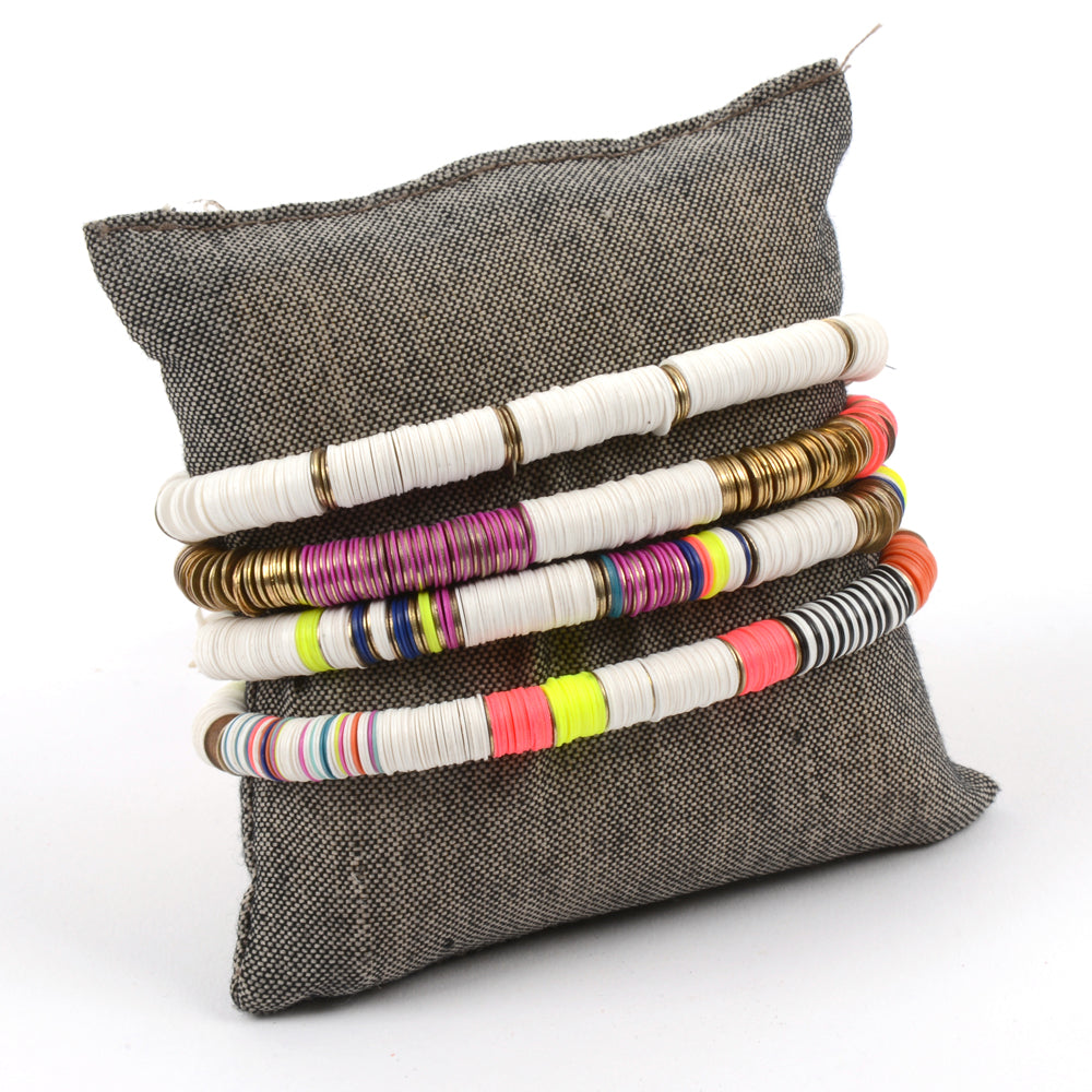 Set of 4 Large Parfait Elastic Bracelets. Each bracelet is made of multi colored small stacked sequins with gold tone metal accents. Easily can be mixed with other bracelets! PILLOW NOT INCLUDED.