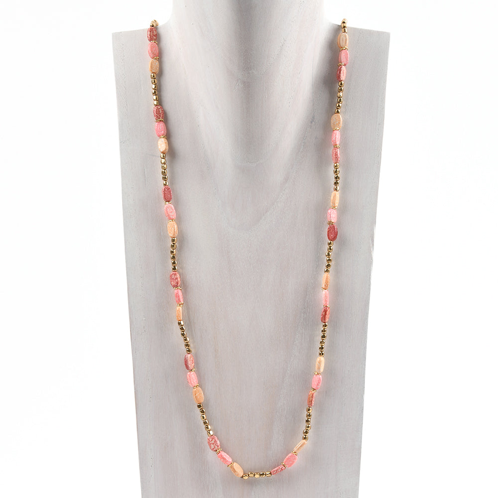 Our 36” Splash necklace is made with bubble finish resin and metal beads. Layer this pullover necklace with another necklace of your choice or wear by itself for a simple look.
