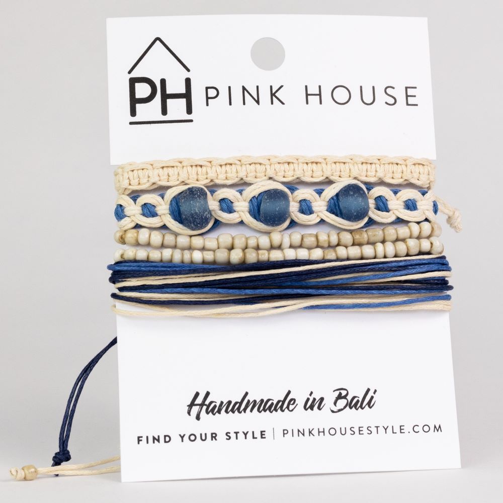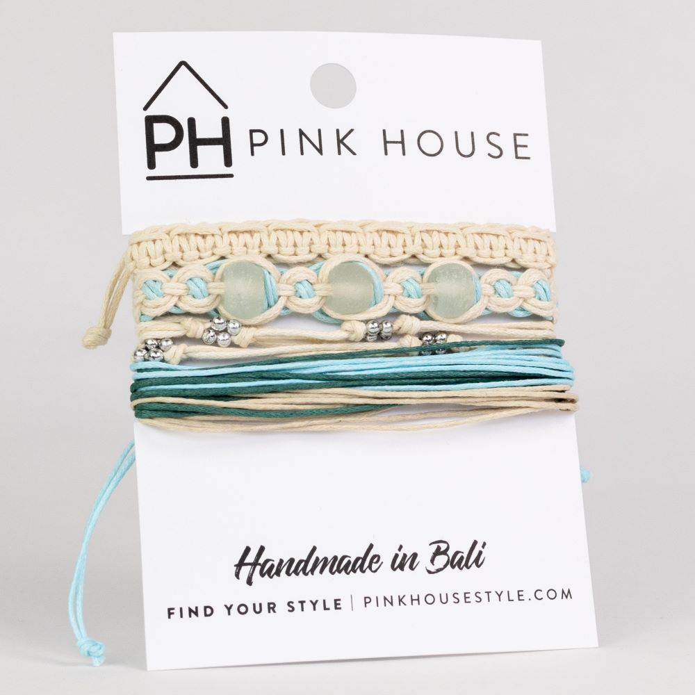 Set of 4 handmade bracelets in complimentary tones. Wear them all together or mix and match for multiple looks. Sliding knot clasp easily adjusts to fit most wrists. Handmade in Bali.