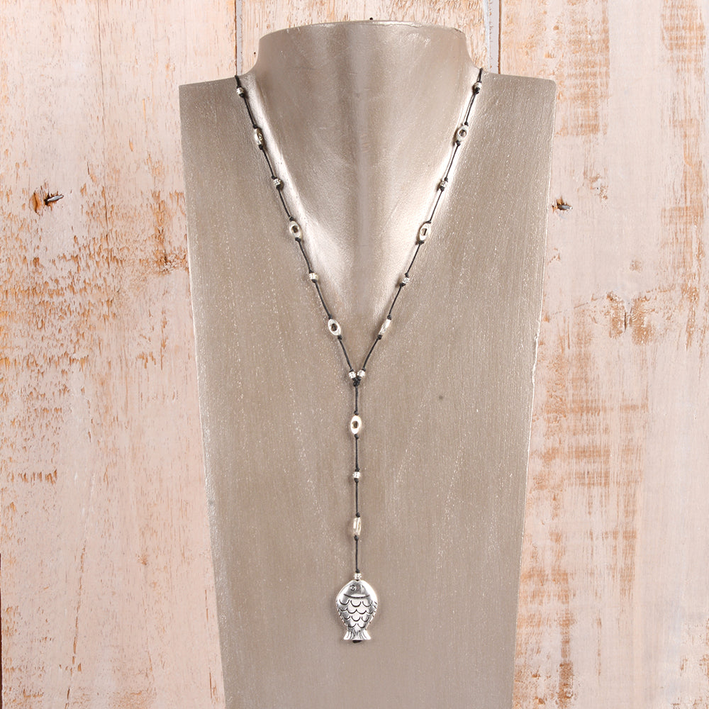 Hit the beach in this long and lean necklace with the right amount of charm. Hand knotted waxed cord. 40" long and easily slips over head.