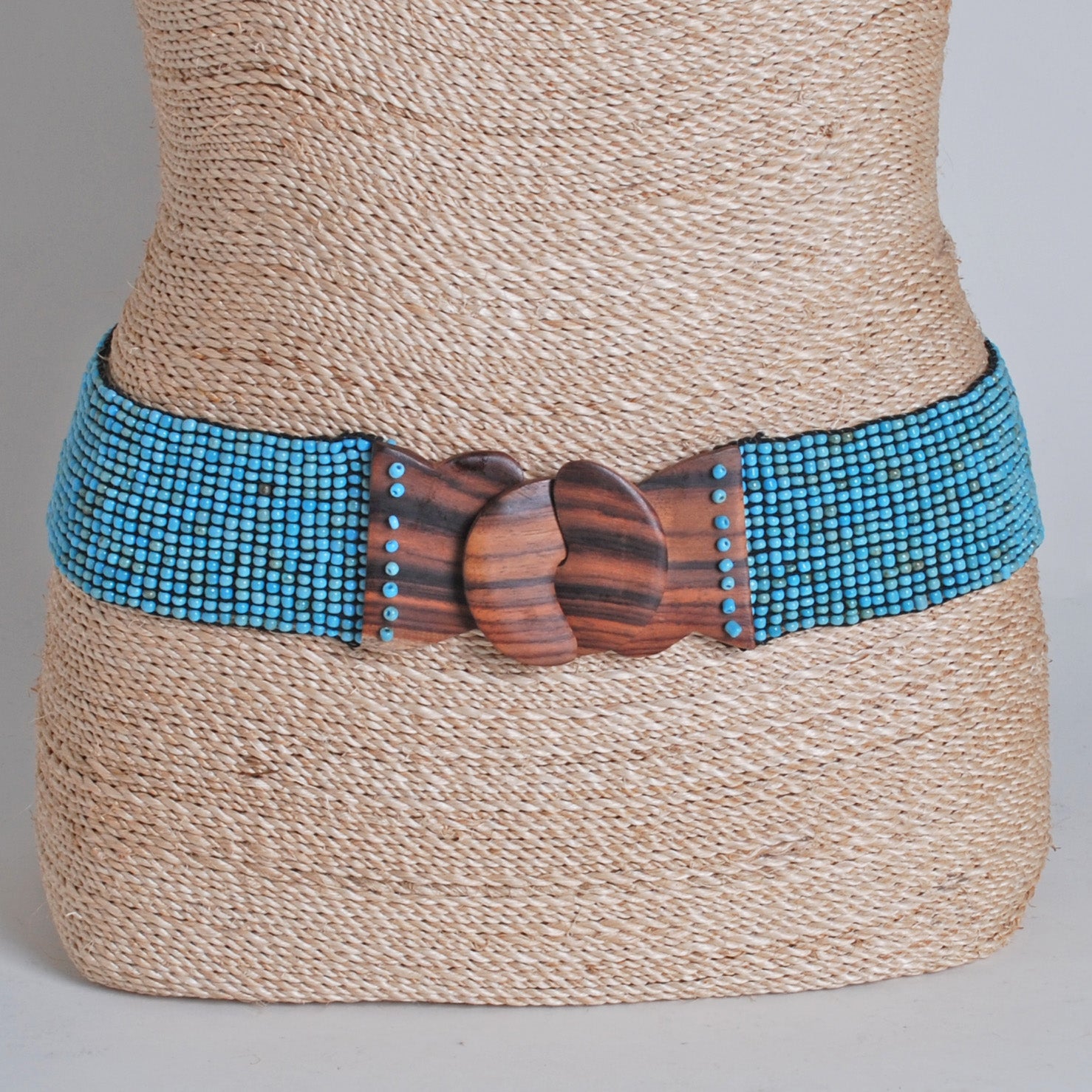 The Curves have it! An beautiful eye-catching rosewood buckle on our most popular Bali glass bead stretch belt. Sure to be a hit! One size fits most. Handmade in Bali.