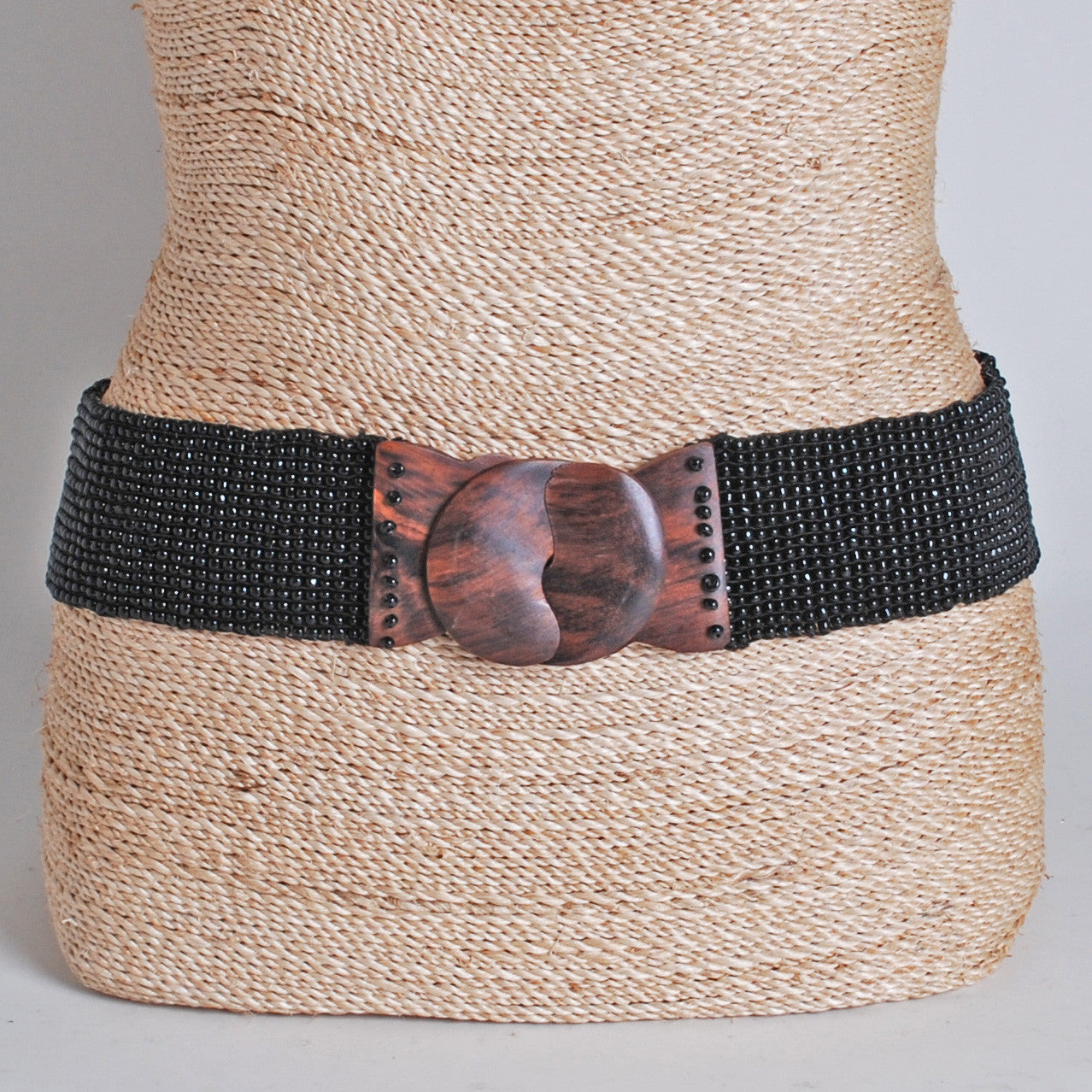 The Curves have it! An beautiful eye-catching rosewood buckle on our most popular Bali glass bead stretch belt. Sure to be a hit! One size fits most. Handmade in Bali.