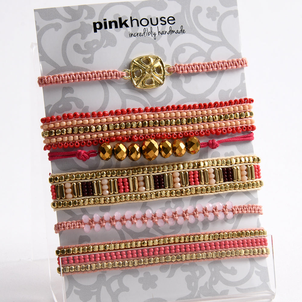 Set of 6 bracelets in complimentary tones combining glass beads, metal beads and crystals. Mix and match for multiple looks. Sliding knot clasp easily adjusts to fit most wrists.