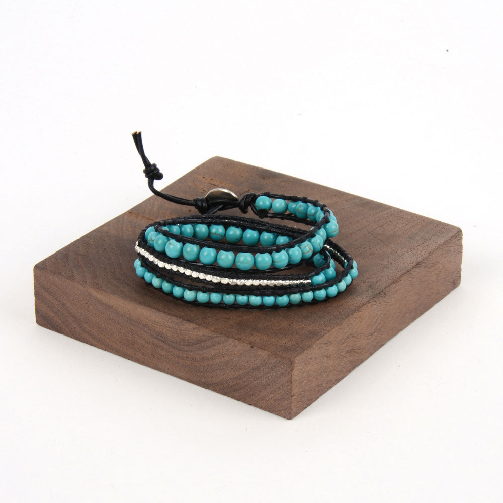 Handmade black leather wrap bracelet with turquoise dyed Howlite and silver plated beads. The triple wrap design gives the illusion of 3 Bracelets. Double loop button clasp to fit almost any wrist.