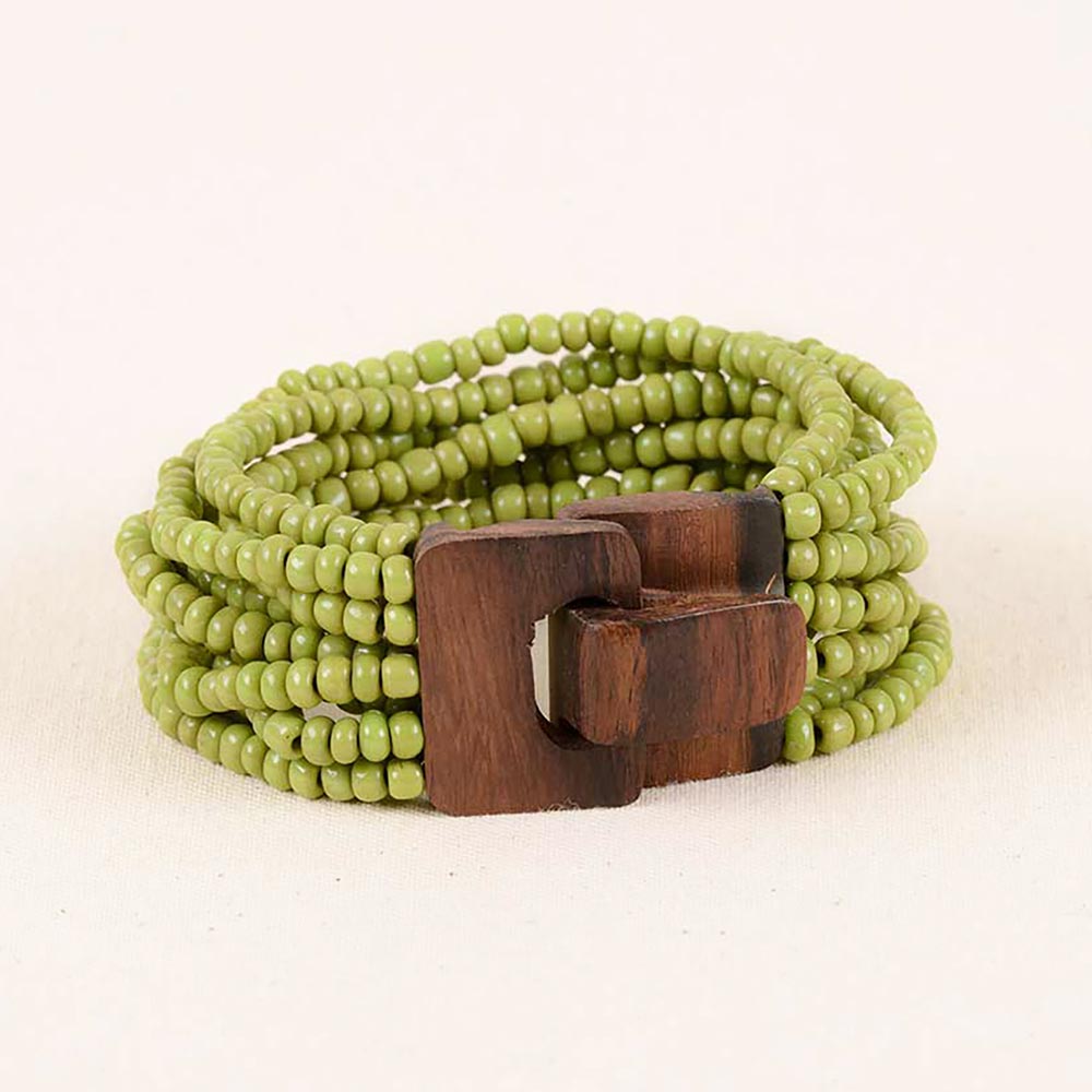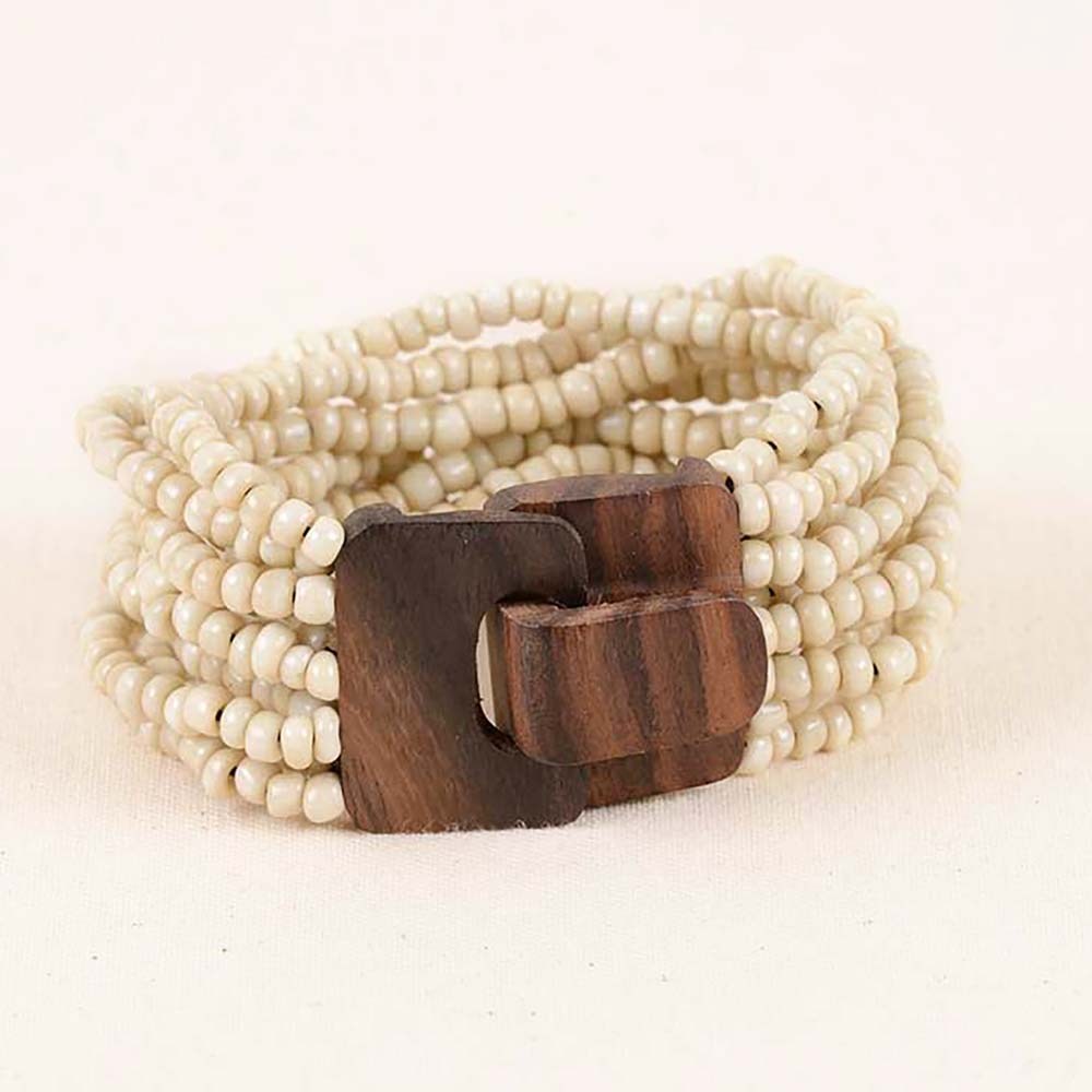 An adorable smaller version of the best selling Wood Buckle Bracelet. Beautiful rosewood with bold Bali glass beads on elastic. One size fits most. Wood Buckle is 1" wide. Handmade in Bali.