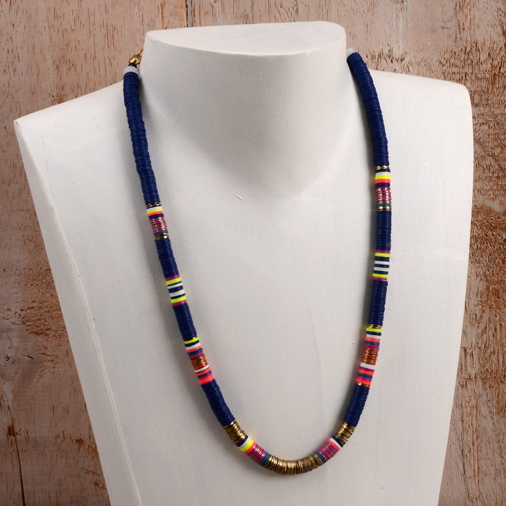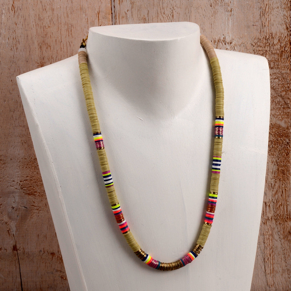 Single strand Parfait Necklace created with multi colored stacked sequins and gold accents. Perfect to layer and mix with longer necklaces.