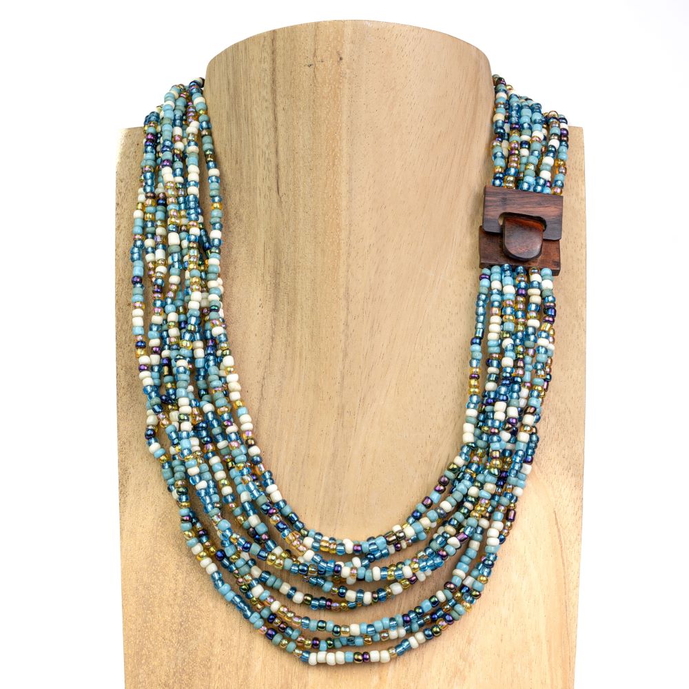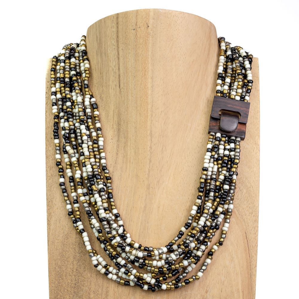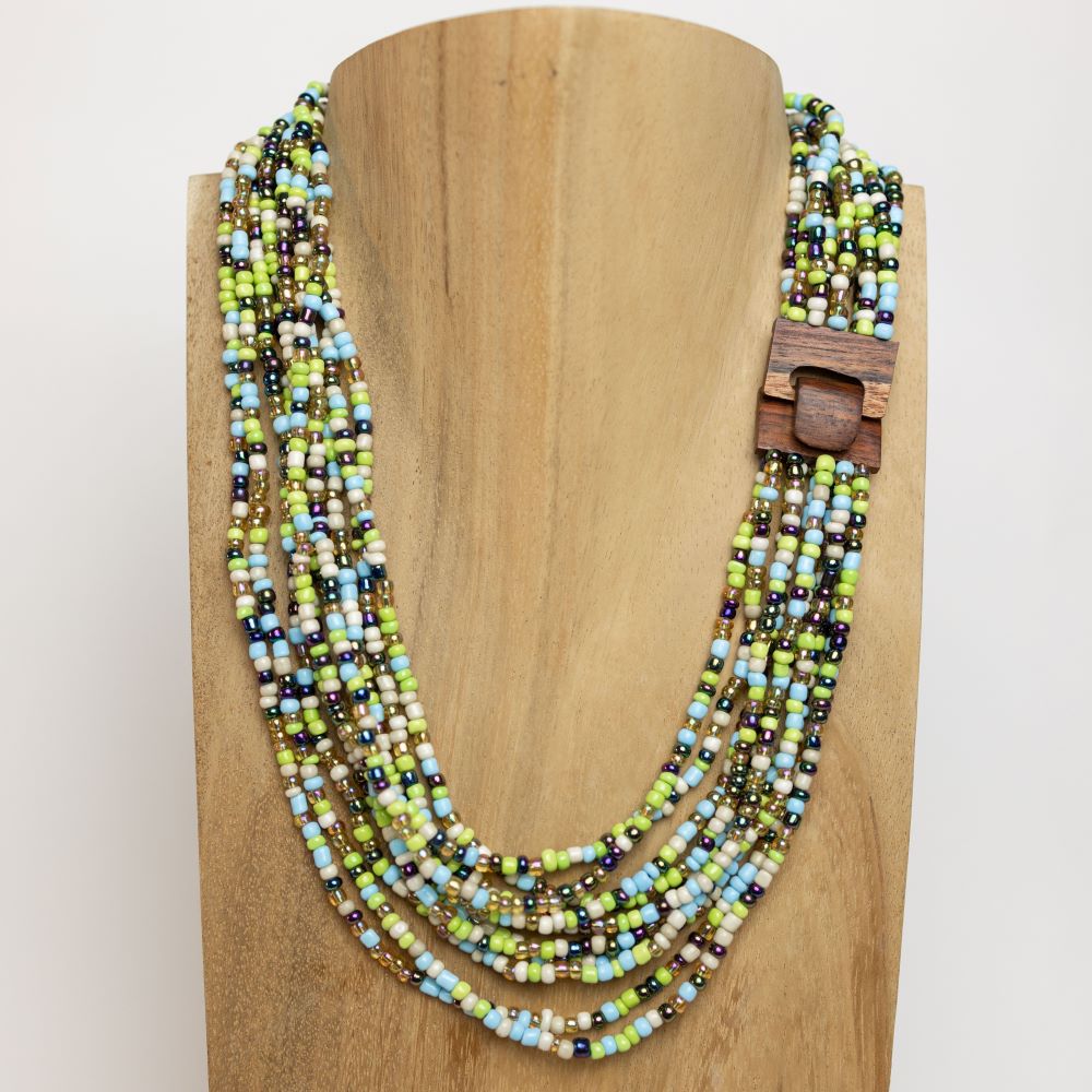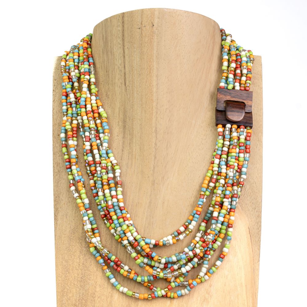 Exciting new mixes of our best selling Bali glass beads in an adorable smaller version of our ever popular Wood Buckle Necklace. Beautiful 1" rosewood buckle serves as an attention grabbing accent to 10 strands of graduated Bali glass beads. Handmade in Bali.