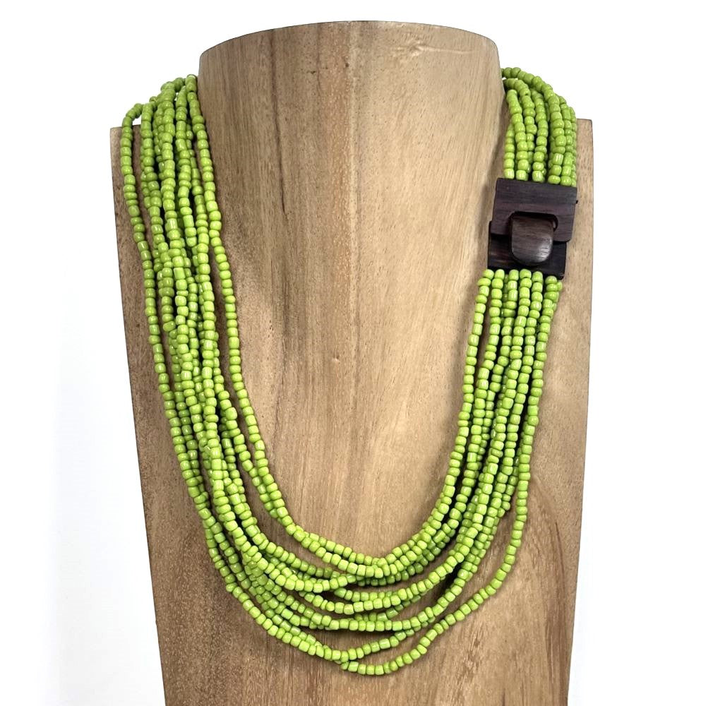 Our best selling Bali glass beads in an adorable smaller version of our ever popular Wood Buckle Necklace. Beautiful 1" rosewood buckle serves as an attention grabbing accent to 10 strands of graduated Bali glass beads. Handmade in Bali.